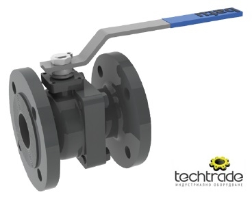 Сферичен кран, индустриален, корпус от 2 части, чугун, на фланци, произход Турция, тяло – сив чугун GG25, сфера – стомана 1.0144, шпиндел – неръждаема стомана 1.4021, уплътнения на сфера – PTFE, О-пръстен – VITON, клас на налягане PN10/16, размери по EN558-1, EN1092-1, температурен диапазон -20⁰ до +180⁰ C, размери DN40÷DN250